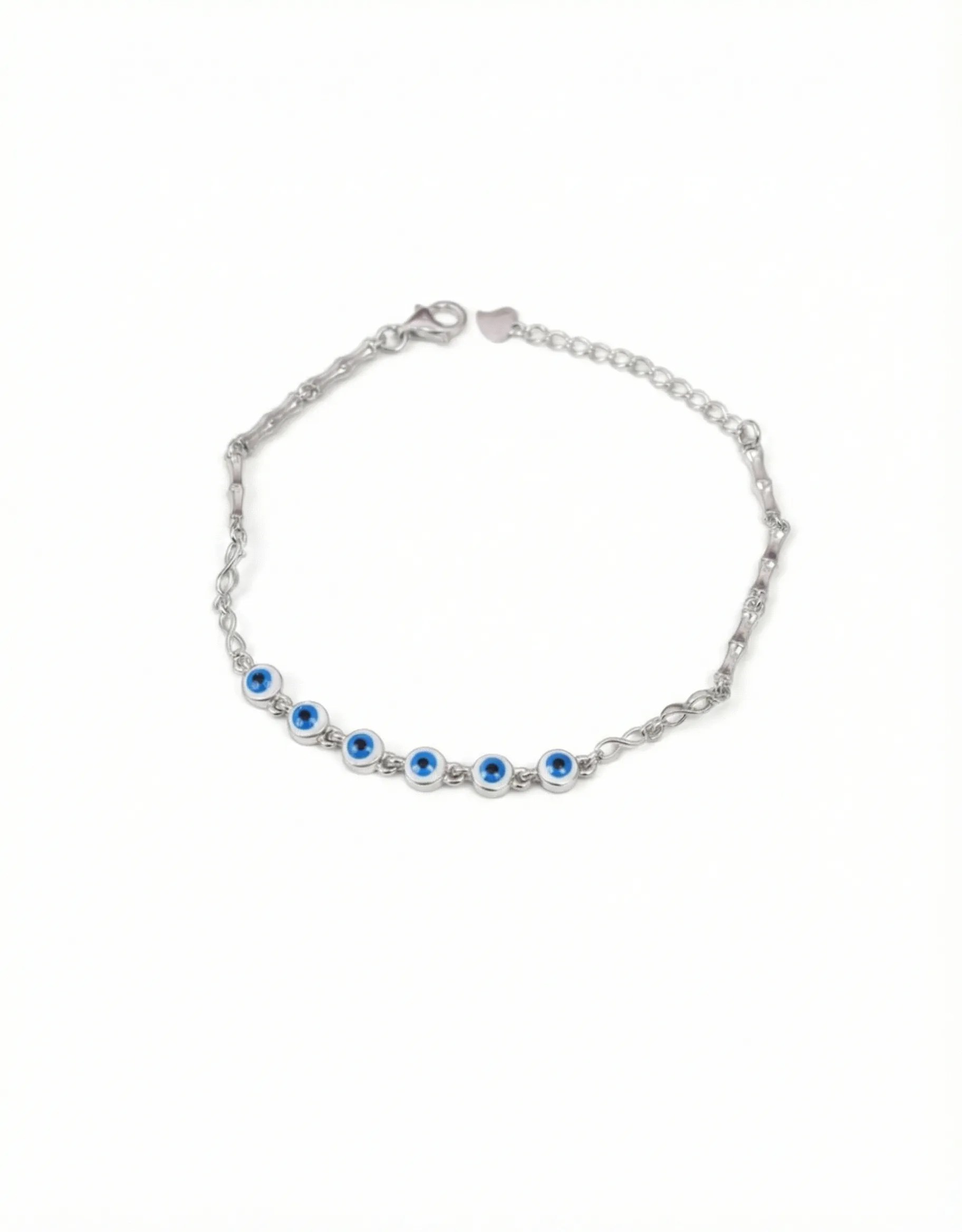 This silver bracelet is the epitome of subtle elegance. Featuring a delicate chain that exudes sophistication, the design is refined enough to enhance your everyday outfit while still standing out as a meaningful statement piece. The highlight of the bracelet is its striking centerpiece: six small, round evil eye charms in complementary white and blue tones. Their dainty size and polished finish add just the right touch of intrigue and allure, making it a versatile accessory for any occasion—whether you’re heading to brunch with friends or out for an evening celebration.